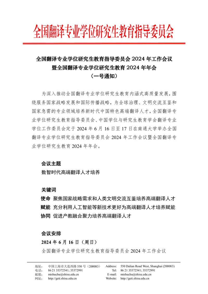 全国翻译专业学位研究生教育指导委员会2024年工作会议暨全国翻译专业学位研究生教育2024年年会(一号通知)