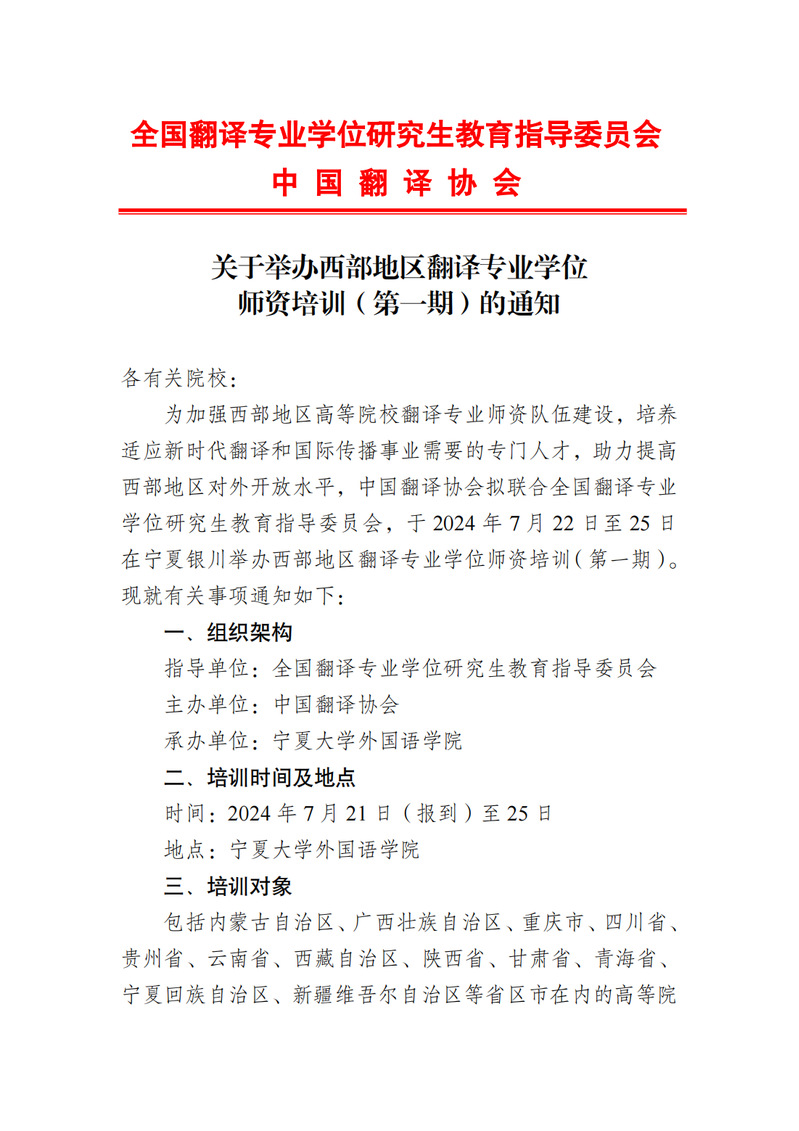 关于举办西部地区翻译专业学位师资培训(第一期)的通知